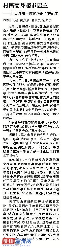 8月10日凌晨4时许,乳山滨海新区白沙滩镇小陶家村村民慕忠禄就拿着钥匙,来到位于多福山国际养生度假区卢塞恩养生小镇商业广场附近的一处超市,开门、打扫卫生、清点货物。作为这家超市的主人,慕忠禄的生活过得有规律、有盼头,而就在一年前,他还只是一名批发水果的小贩,四处奔波、苦心经营。